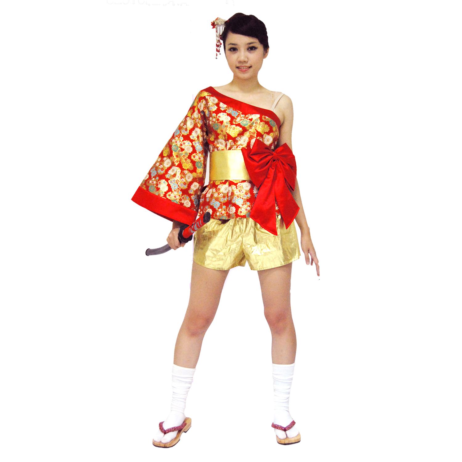 紅斜肩和服+褲